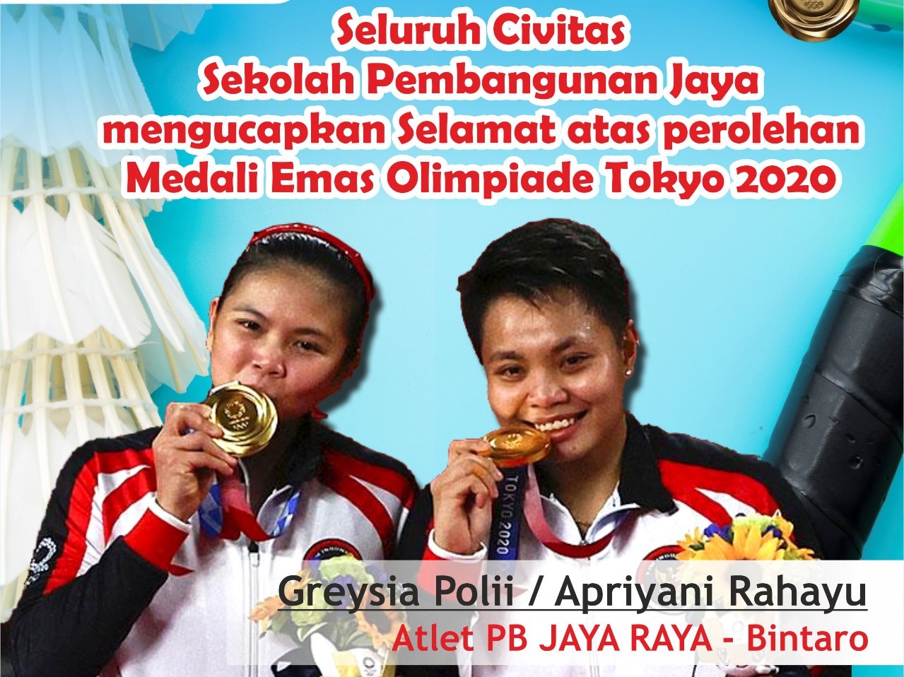 Selamat kepada Greysia Polii dan Apriyani Rahayu, Selamat kepada Greysia Polii dan Apriyani Rahayu, kita patut bangga akan prestasi yang diraih oleh Atlet PB Jaya Raya